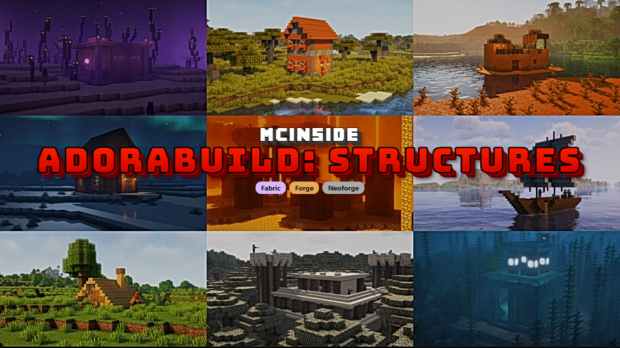 AdoraBuild: Structures is a worldgen mod that adds over 100 new biome-specific structures — including houses, castles, temples, and hidden treasures — to Minecraft, available for Fabric, Forge, and NeoForge loaders.