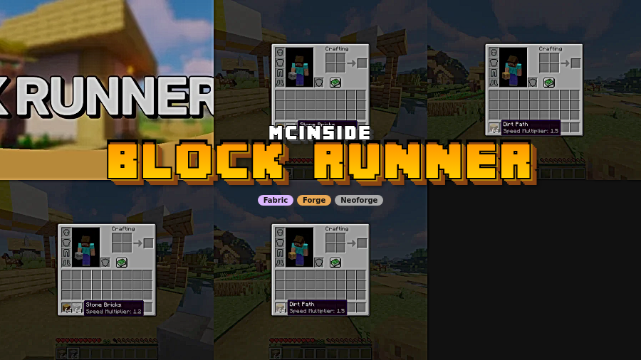 Block Runner Mod is a utility mod that makes you run faster on certain blocks, including path blocks, for Minecraft using Fabric, Forge, and NeoForge.