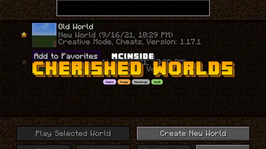 Cherished Worlds is a utility mod that lets you favorite, pin, and bookmark your Minecraft worlds and servers so they always appear at the top of your selection list and cannot be accidentally deleted, available for Fabric, Forge, NeoForge, and Quilt.