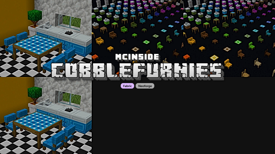 CobbleFurnies is a decoration and furniture mod that adds Cobblemon-inspired furniture pieces — including stoves, chairs, lamps, cabinets, and curtains — to Minecraft, available for both Fabric and NeoForge loaders.
