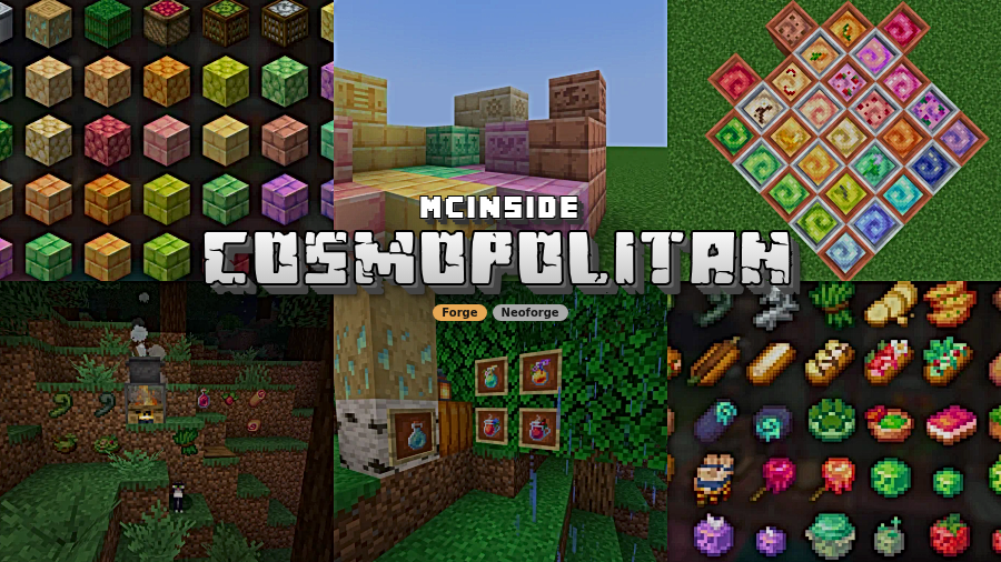 Cosmopolitan is a food-focused Minecraft mod that expands vanilla ingredients, drinks, desserts, and cross-mod food compatibility for Minecraft Forge and NeoForge.