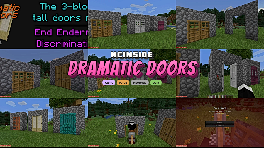 Dramatic Doors Mod solves a simple building limitation in Minecraft: standard doors can look undersized on castles, halls, and other large structures. This mod adds taller door variants that stand three blocks high instead of two, giving decorative builds a more grand and consistent entrance style while keeping the familiar vanilla door lineup.
