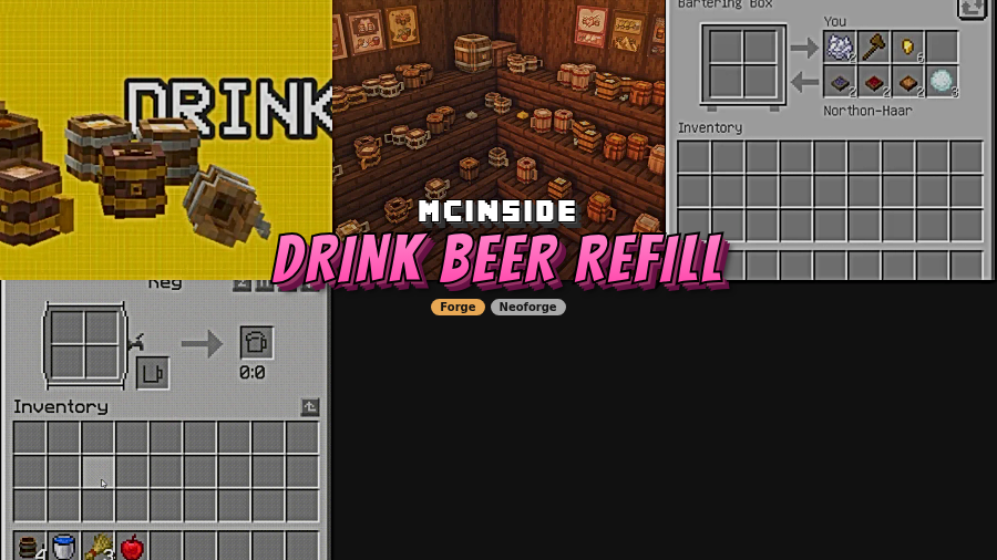 Drink Beer Refill is a food and brewing mod that adds beer crafting, bartending, and bartering systems for Minecraft Forge and NeoForge.