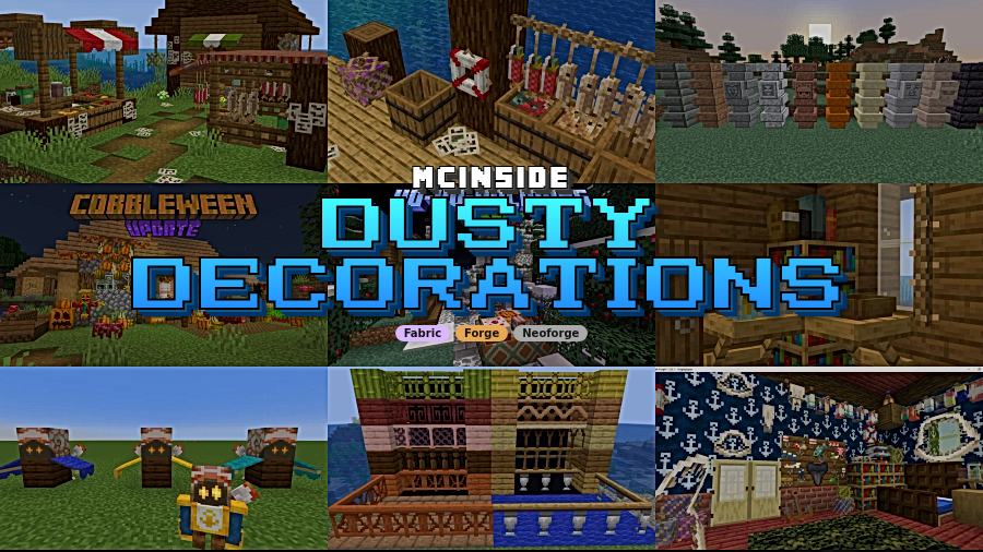 Dusty Decorations Mod is a decoration mod that adds rustic port, market, and kitchen-themed blocks for Minecraft Fabric, Forge, and NeoForge.