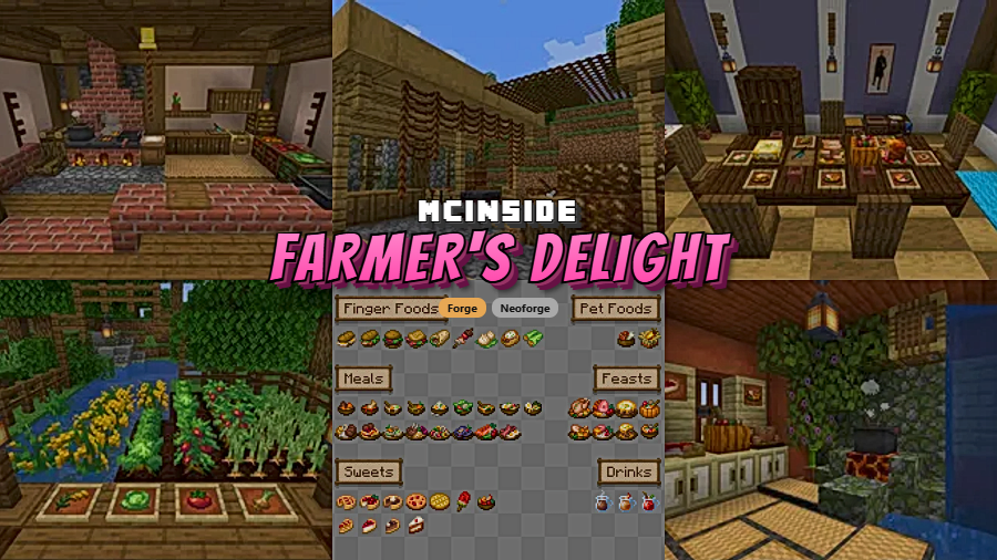 Farmer's Delight is a farming and cooking expansion mod that adds a rich variety of crops, recipes, tools, and decorations to Minecraft, available for Forge and NeoForge loaders.