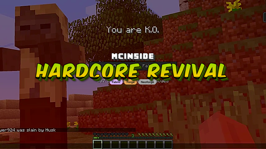 Hardcore Revival is a game-mechanics mod that lets players revive fallen teammates during a timed K.O. window instead of losing them permanently, available for Minecraft Fabric, Forge, and NeoForge.