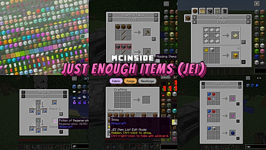 Just Enough Items (JEI) is a utility mod that lets you browse every item and recipe in Minecraft through a clean, searchable overlay, available for Fabric, Forge, and NeoForge.
