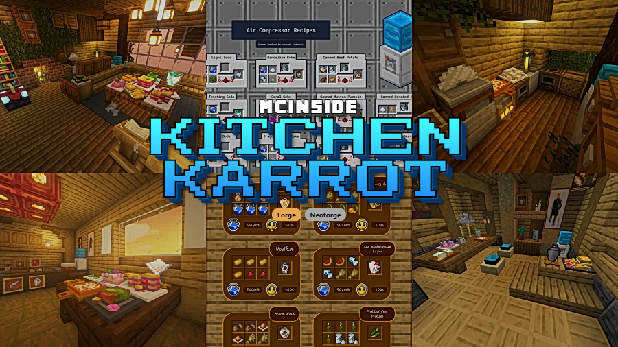 Kitchen Karrot Mod is a food-focused Minecraft mod that expands everyday meals, plating, and brewing for Minecraft Forge and NeoForge. It adds more than 90 new foods with simple mechanics that appear to stay close to a vanilla-friendly style.