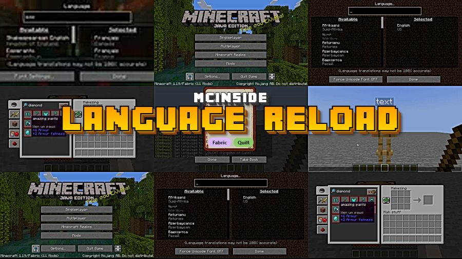 options.txtfile does not contain alang:entry, Language Reload automatically detects your system language and applies it. This is a small but thoughtful touch for first-time players or anyone resetting their configuration files. - Keyboard Shortcuts for Language Control — Press F3 + J to reload all language files on the fly without restarting the game — useful for resource pack developers testing translations. Press Shift + F3 + J to cycle through your selected languages in real time, letting you quickly preview how the game looks in each language without opening any menus.