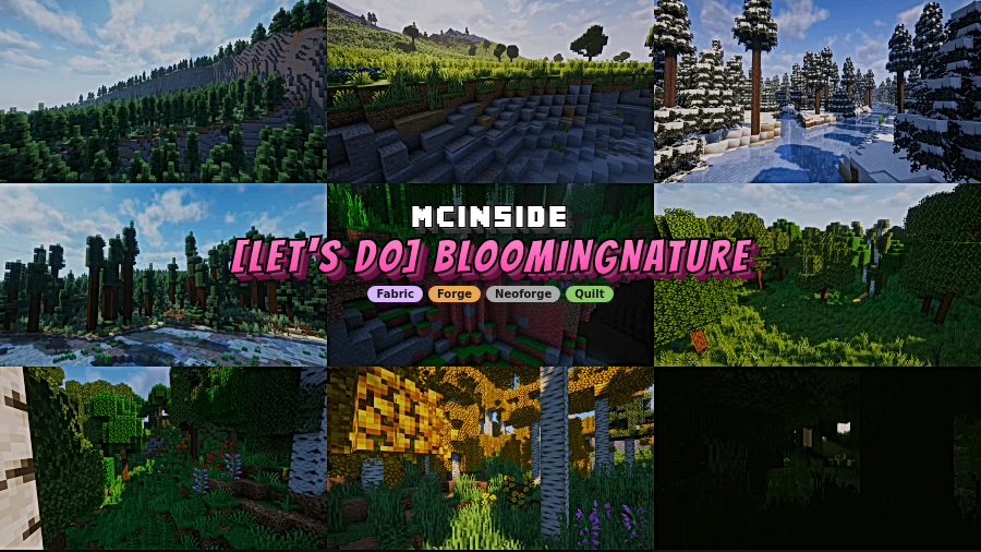 [Let's Do] BloomingNature is a worldgen mod that reshapes nearly every vanilla biome with new trees, vegetation, sub-biomes, terrain blocks, and ambient detail for Minecraft Fabric, Forge, NeoForge, and Quilt.