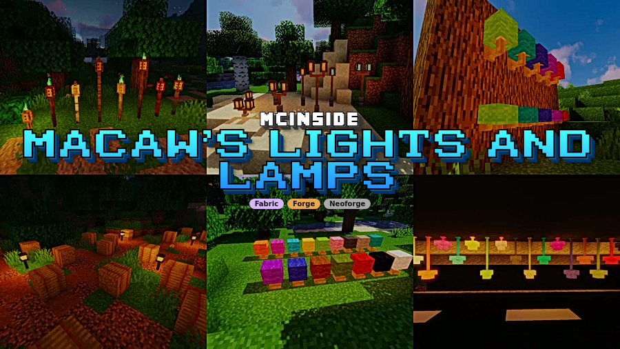 Macaw's Lights and Lamps is a decoration mod that adds vanilla styled lamps, torches, street lamps, paper lamps, wall lamps, slabs... Make your world brighter! for Minecraft 26.1, 1.21.11, 1.21.10, 1.21.9, 1.21.8, 1.21.7 on Fabric, NeoForge, Forge.