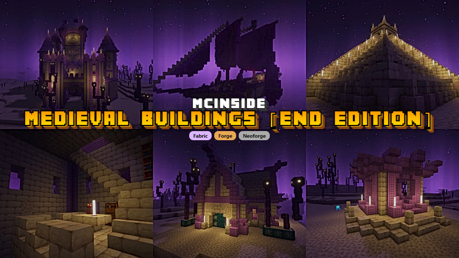 Medieval Buildings [End Edition] Mod is a world generation and adventure mod that adds five medieval-style structures to the End for Minecraft on Fabric, Forge, and NeoForge.