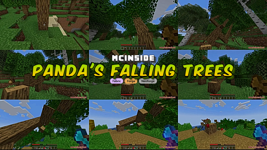 While most tree-chopping mods instantly break all logs at once, Panda's Falling Tree's Mod adds a physical falling animation — the tree actually tips over and collapses, similar to how Dynamic Trees handles it, but without changing vanilla tree generation.