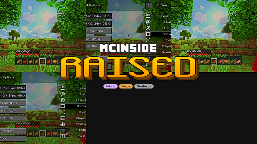 Raised Mod is a utility mod that lets you reposition vanilla and supported modded GUI layers and fix the hotbar selection texture for Minecraft Fabric, Forge, and NeoForge.