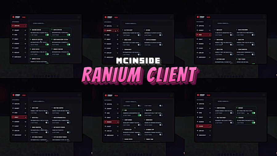 Based on available information, Ranium Client Mod is a PvP-focused utility client built around automation, combat tools, and server-specific modules, with particular emphasis on Crystal PvP and Donut SMP gameplay.