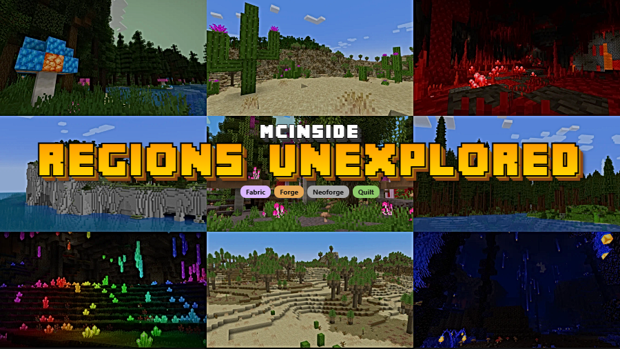 Regions Unexplored is a biome overhaul mod that adds over 70 new biomes to the Overworld and Nether in Minecraft, available for Fabric, Forge, NeoForge, and Quilt mod loaders.
