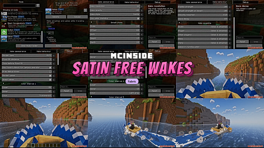 Water movement in Minecraft can look static during travel. Satin Free Wakes Mod adds wakes, waves, and splashes when entities move through water, with boat wakes appearing at the oars and water shooting outward on both sides for a more natural-looking result.
