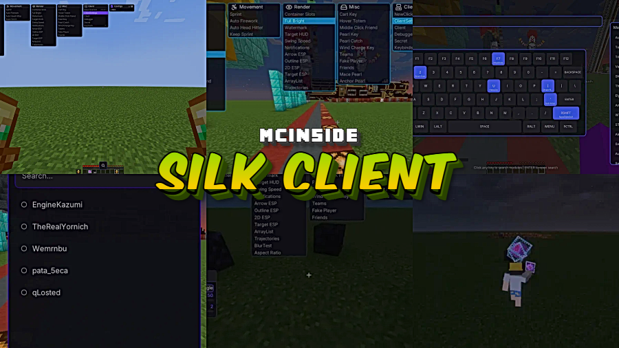 For players focused on Crystal PvP, Silk Client Mod brings crystal and anchor combat tools, attack support features, and quick keybind options into a clean, organized interface. The available data points to a PvP utility client built for fast combat actions and automation on Minecraft 1.21.4 with Fabric.