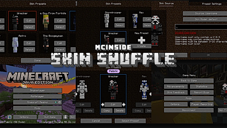 Skin Shuffle is a Minecraft mod that adds Effortless in-game skin customization and management—change, store, and customize your skins with SkinShuffle. Instant skin changes available on compatible servers. for Fabric on Minecraft 26.1.1 to 1.21.9.