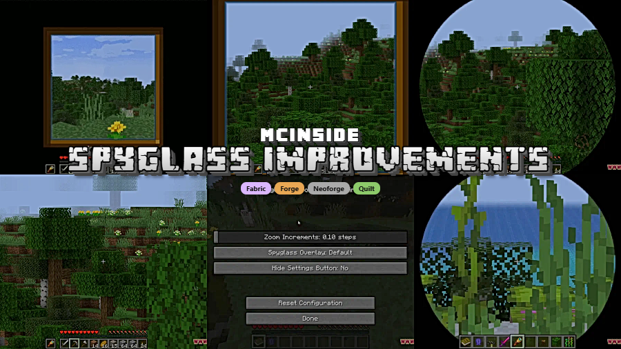 Minecraft's spyglass is a neat concept held back by clunky controls and a fixed zoom level — Spyglass Improvements Mod fixes all of that. This client-side mod by Im_JC52 overhauls the vanilla spyglass with smooth scrollable zoom, a dedicated hotkey for instant access, and customizable overlays that make long-distance scouting actually enjoyable. Downloaded over 2.3 million times since its 2022 release, it has become one of the most popular quality-of-life mods for Minecraft across Forge, Fabric, NeoForge, and Quilt.