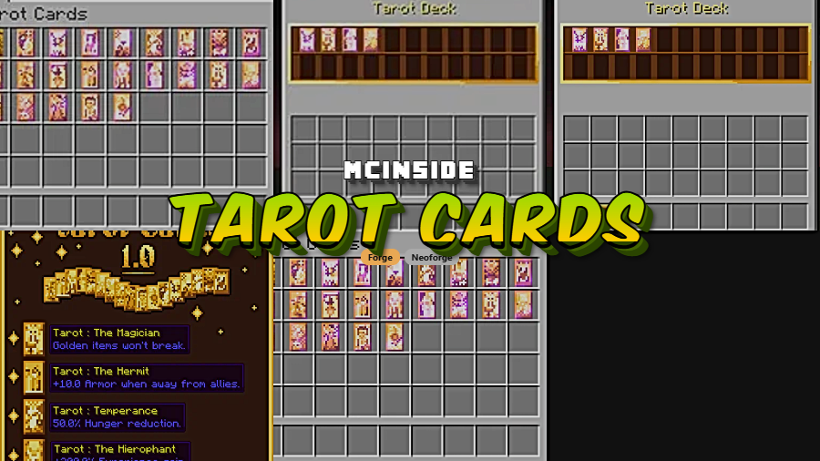 Tarot Cards is a magic equipment mod that adds the 22 Major Arcana tarot cards to Minecraft, each with a passive bonus that works while the card is carried. Instead of crafting them directly, you discover them through world loot and build your collection over time.