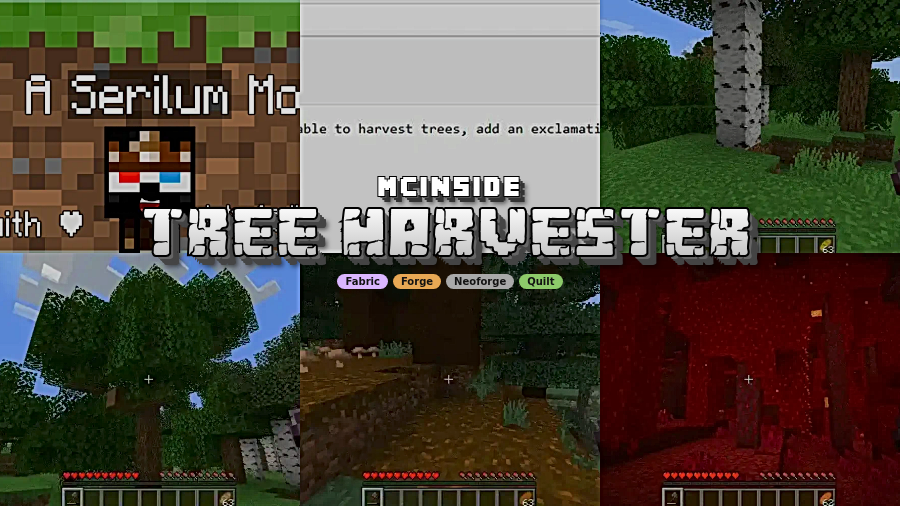 Tree Harvester Mod is a utility mod that lets you harvest full trees, warped trees, and huge mushrooms by chopping a single block with an axe for Minecraft Fabric, Forge, NeoForge, and Quilt. It also adds fast leaf decay and sapling placement to streamline wood farming in survival worlds.