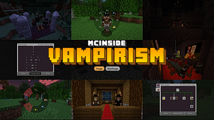 Vampirism is an adventure and magic mod that lets you become a vampire, become a vampire hunter, or build an entire survival run around the conflict between the two. It adds progression, role choice, special powers, drawbacks, and a large set of related addons around the same theme.