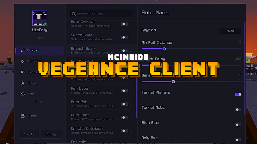 For players who take Crystal PvP seriously, Vegeance Client Mod delivers a full suite of combat automation tools designed to sharpen every aspect of your fights. From auto-placing End Crystals to intelligent weapon swapping and potion management, this Fabric-based client handles the split-second decisions that separate good PvP players from great ones. Whether you're dueling on anarchy servers or practicing crystal combos, Vegeance gives you the reactive edge that manual inputs alone can't match.