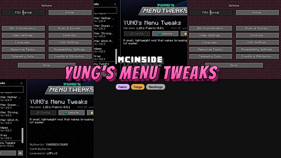 - Download YUNG's Menu Tweaks for your loader and Minecraft version from the link below.