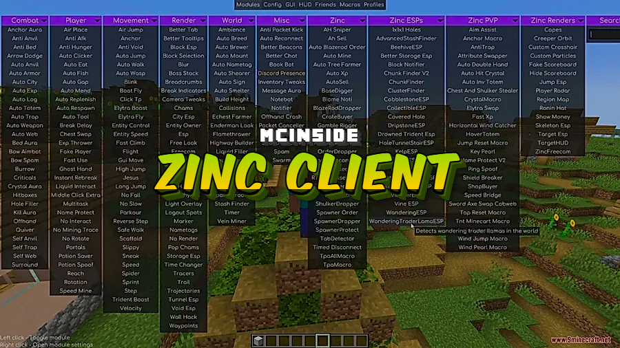 Zinc Client Mod matters if you already use Meteor Client and want more tools aimed at high-risk multiplayer play. The addon is described as especially useful on anarchy servers like DonutSMP, where base finding, PvP, and automation all matter, and its feature set centers on adding many extra modules with broad customization.