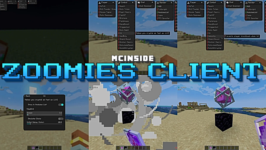 Zoomies Client includes modules like Reach and Triggerbot that are typically flagged by anti-cheat systems. Always check a server's rules before enabling combat or movement modules — using them on servers that prohibit such tools can result in bans.